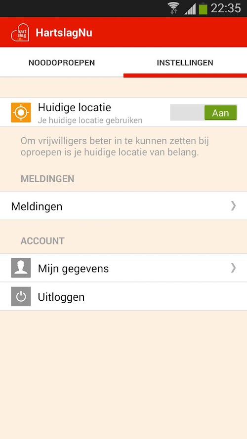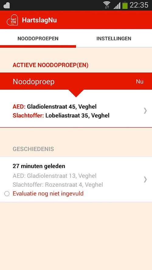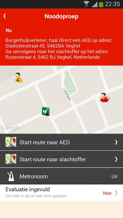 Anyone who is logged in the warning HartslagNu can use the app. For proper operation it is important that your smartphone can receive push notifications for this app. After the Emergency Ambulance protocol has sent two ambulances, the alarm HartslagNu automatically to the victim. Using the geographic data of the victim, the system searches for civilian workers in the area. The system aims for a perfect distribution of the civilian aid workers, 1/3 directly to the victim (reanimators) and 2/3 via an AED (AED providers). AED is located then you get sent this code in a locked cabinet. For the time being remains alarming SMS active and there will be a total of up to 30 civilian rescuers still be alarmed. If the app. is installed and has been chosen by alerting a push message through the app. you get no more SMS. The app. is equipped with a metronome, driving directions and a private alarm sound.