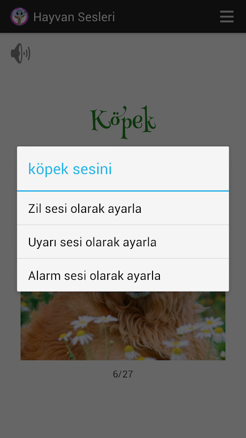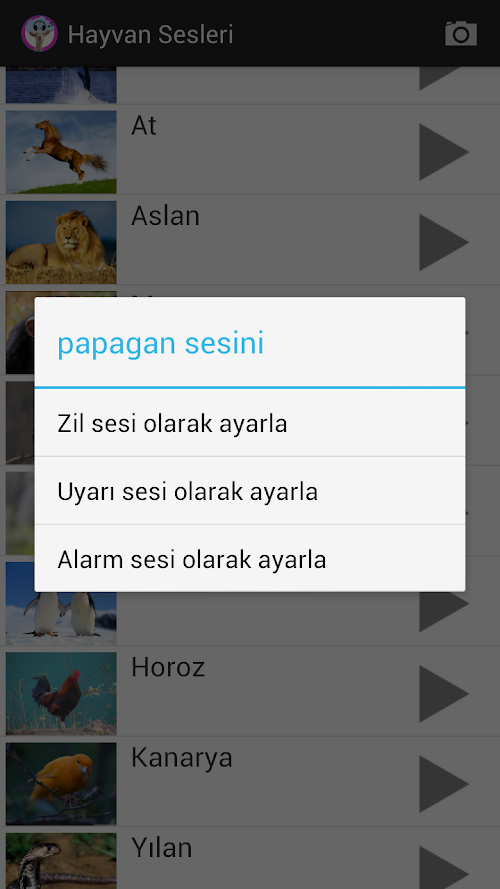 - İlk modu hayvanların büyük resimlerinin gösterildiği moddur. Burada hayvanlara basılı tutarak zil, alarm veya uyarı sesi olarak ayarlayabilirsiniz