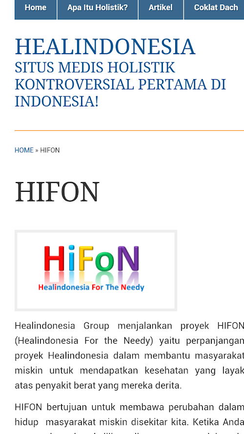 Healindonesia adalah situs yang dirancang khusus untuk berbagi sains medis holistik kepada masyarakat, terutama sains medis holistik Ananopathy. Ananopathy adalah pengobatan yang memanfaatkan teknologi modern dengan alam untuk mengatasi berbagai permasalahan kesehatan. Artikel-artikel di HI (Healindonesia) berasal dari kumpulan tulisan Dt Awan sendiri, terjemahan artikel di luar negeri, dan juga dari penulis lain yang telah diseleksi.