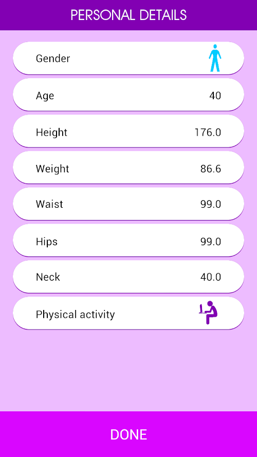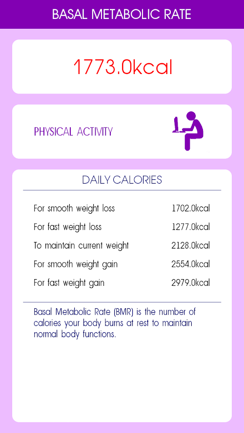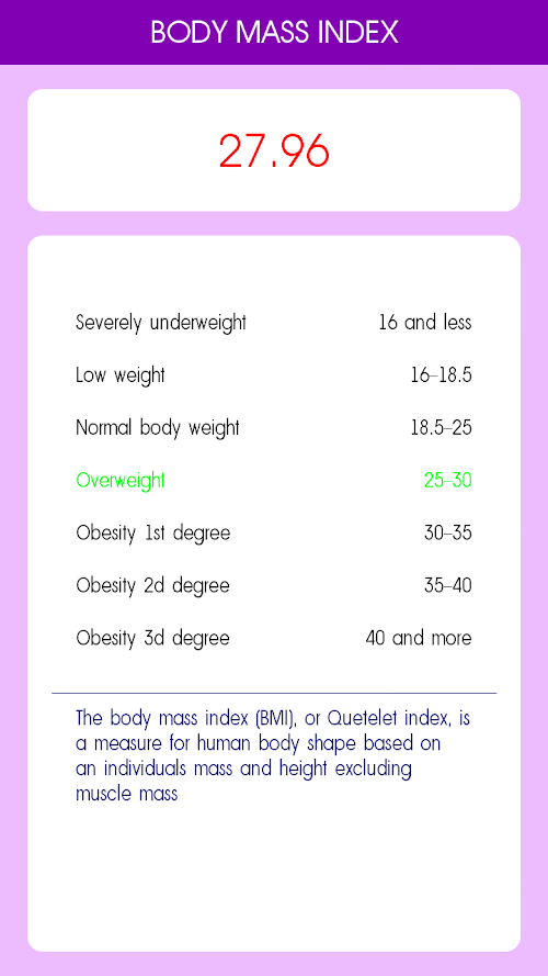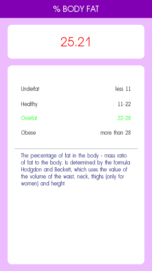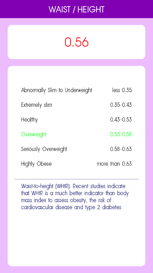 Health calculator is a program which is based on Your personal data (height, weight, age, gender, waist, hips) calculates the body mass index (BMI), fat content in the body, waist-to-height ratio (WHTR). These indicators are very important for health, as they help you determine the normal weight or not and what Your healthy weight (i.e., the weight at which the risk of developing diseases such as hypertension, diabetes, cardiovascular disease, joint problems and many others associated with excess weight tend to zero.) Also calculates your basal metabolic rate, and provided recommendations on daily allowance of calories for weight loss, maintain or gain weight.