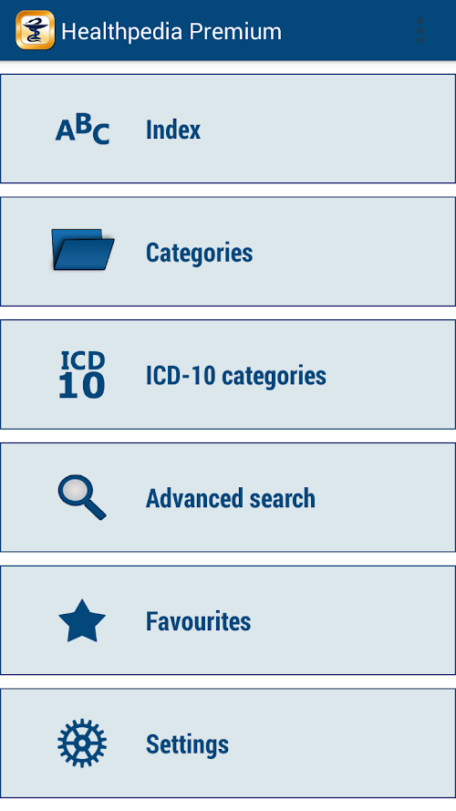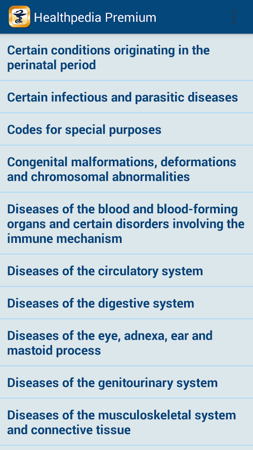 Healthpedia Premium is an extension of free Healthpedia. App ncludes a built-in catalog of diseases and conditions cataloged according to ICD10 standards.