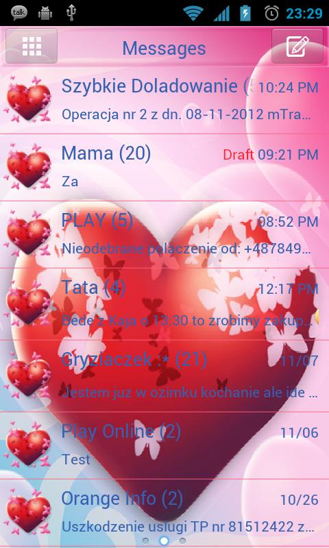 Hearts Theme is made specially for ladies who like love and each beautiful day. Discover your phone once more and be happy with its sweet and cool appearance. From today let writing sms be more nice and colorful. Each icon are pink and designed specially for you. Main screen shows heart, made in High Definition and 3D technology. Our skin will be great looking on your smartphone and new live style.