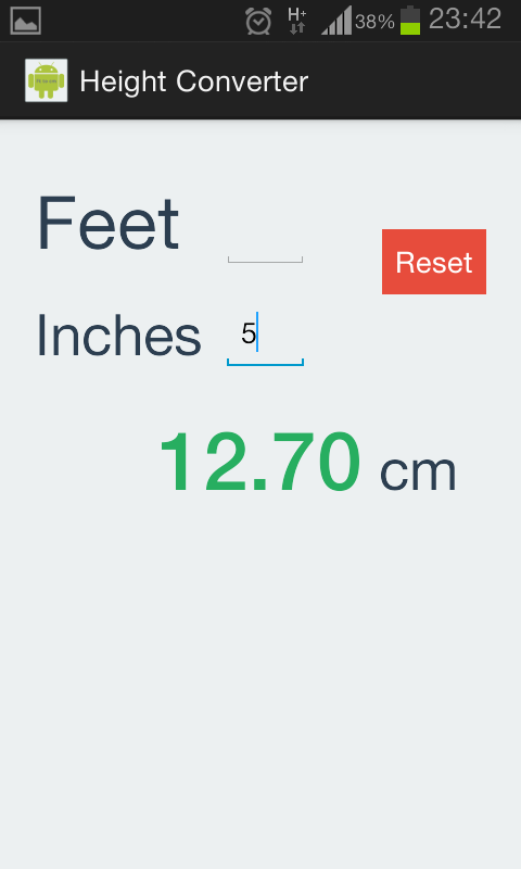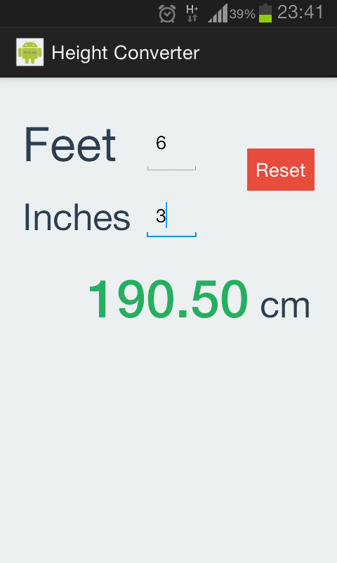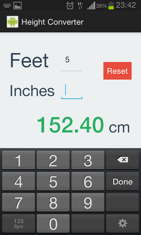 Height converter is a simply app which convert height units, feet/inches to centimeters. It is easy to use just type feets or inches to field.