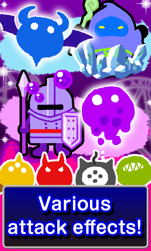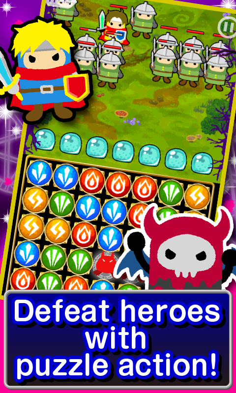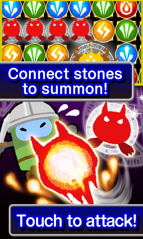 Swipe magic stones to switch their positions. Line up 4 or more of the same color, horizontally or vertically, to summon demons, and touch those demons to attack heroes.