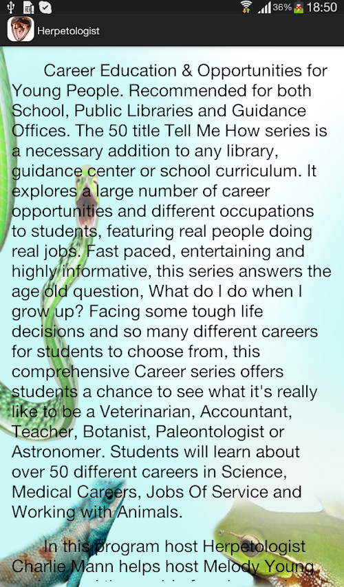 In this app host Herpetologist Charlie Mann helps host Melody Young understand the world of snakes and get over her fear of the slimy creatures. Subjects Covered Include: What is a herpetologist? Are all snakes poisonous? What is the difference between poison and venom? What is anti-venom? What is the most dangerous snake in the world? Why do does a cobra spit? How do you tell the difference between venomous and non-venomous snakes? What is an amphibian? Can snakes swim? What do snakes eat? Can snakes make a good pet?