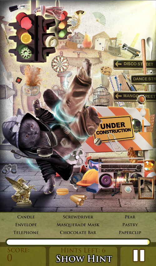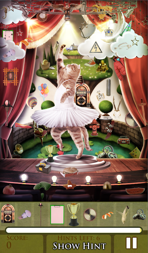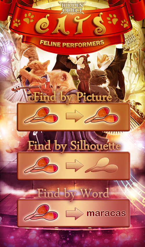 Be entertained with the cats' performances while finding hidden objects in 8 different stages, three different game modes and three difficulty levels! Move to the groove with the krumping cats or sway with classic jazz, or jam and chant with the feline rock star and hum with the classic musicians!