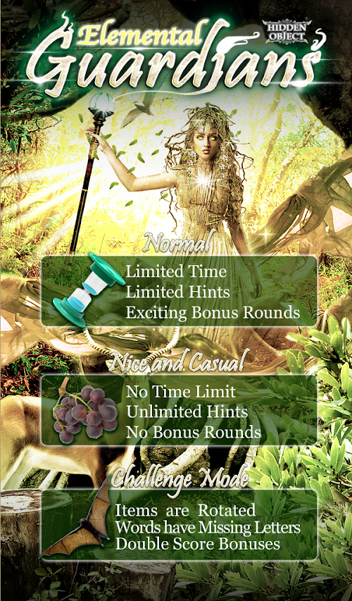 Help the Elemental Guardians find hidden objects that might help put the elementals at ease within 8 locations to watch over, three difficulty modes to choose from and four game modes to play!