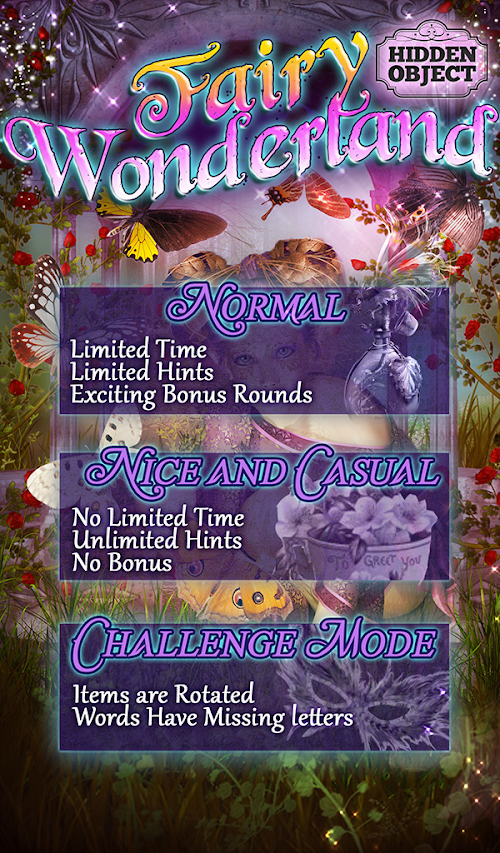 Find unique hidden objects among the stunning images. Fairy Wonderland contains 8 artistically-crafted levels, filled with items. There are many different game modes and the hidden items change each time you play.
