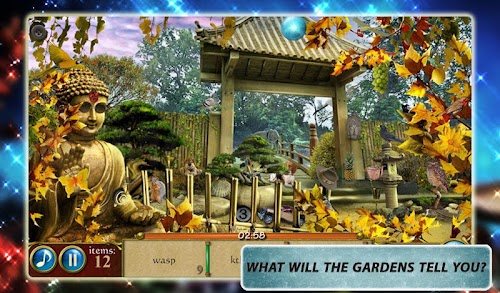 This wonderful hidden object game gives you the unique opportunity to find amazing life-like items in different locations of gardens around the world. Unique new Hidden Object scenes, with 3D effects! Zoom in to uncover hidden parts. What's hiding behind that statue? Ah look, butterflies flying by!