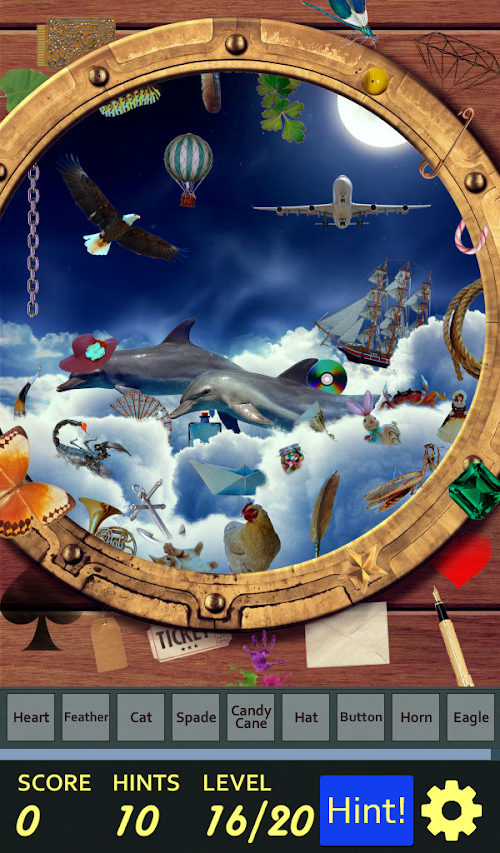 Creatures of the ocean have migrated to the sky! Images are in full HD with a zoom feature for those hard to find items. Our latest Hidden Object features 20 fantastic scenes, accompanied by beautiful music and multiple ways to find the hidden items.