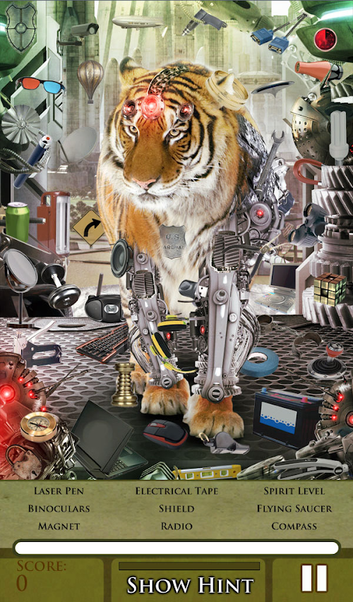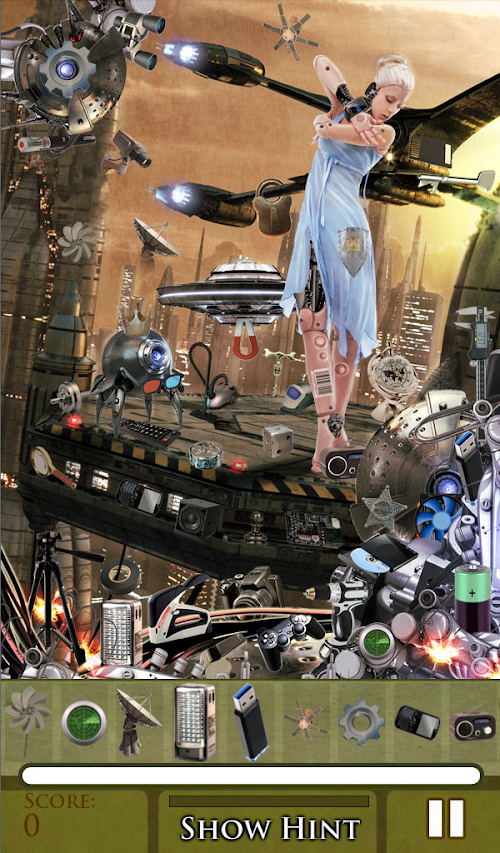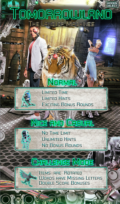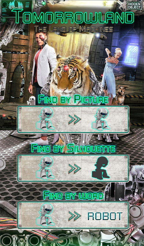 When mankind's existence neared extinction, humans upgraded themselves like machines, thus the beginning of Tomorrowland. Cyborgs were born - body parts were replaced with machines. Even the animals transformed, the natural flow was disrupted. And the machines dominated the land. With these changes, you need to adapt too! Find hidden objects needed to achieve transformation in 20 futuristic stages!