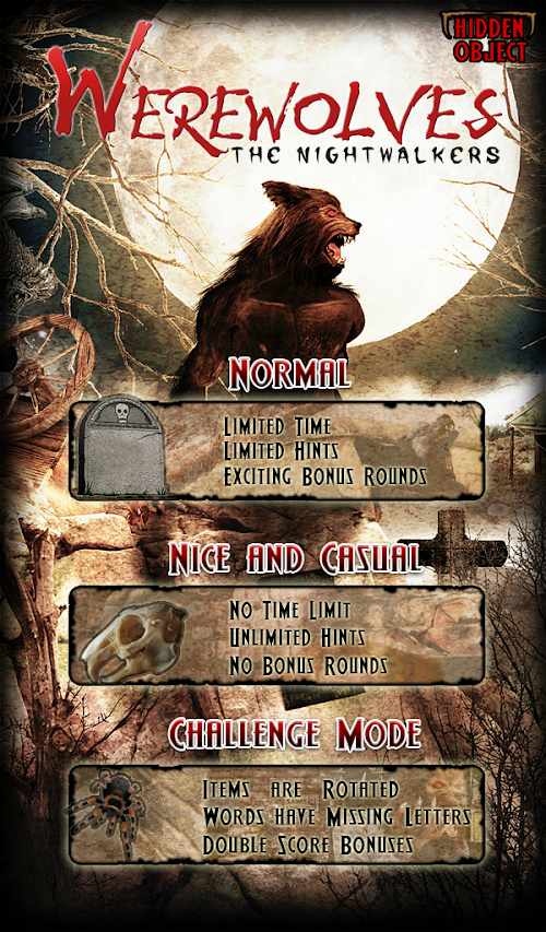 Get into the lupine spirit and hunt for hidden items among the spooky werewolf scenes. We have included a new difficulty selection where experienced players can choose to blend the items into the background for an extra challenge. Beware the full moon!