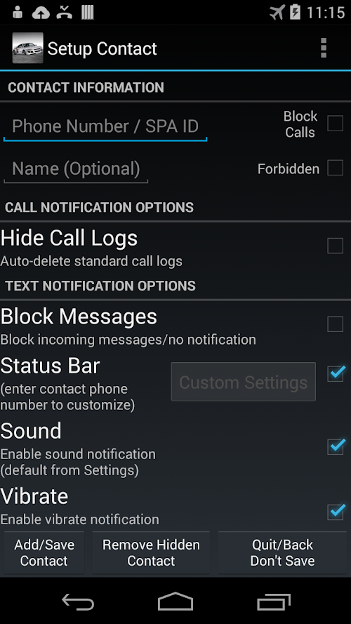 Hide texts messages for 5 contacts safely with a password protected decoy “Car Wallpaper” app.  Once you download this app it will place a “Car Wallpaper” icon in your app drawer. The app appears to have errors to anyone else that looks at it.  Text from selected contacts will be in this app only and will not be put in your “regular” text messages.  Text messages in our app are completely separate and secure. When text messages are received, you get a notification in the status bar that says, “Subscription notice,” which goes with the Car Wallpaper theme of the app having a “subscription error.” Only you will know it’s a notification for a text message.