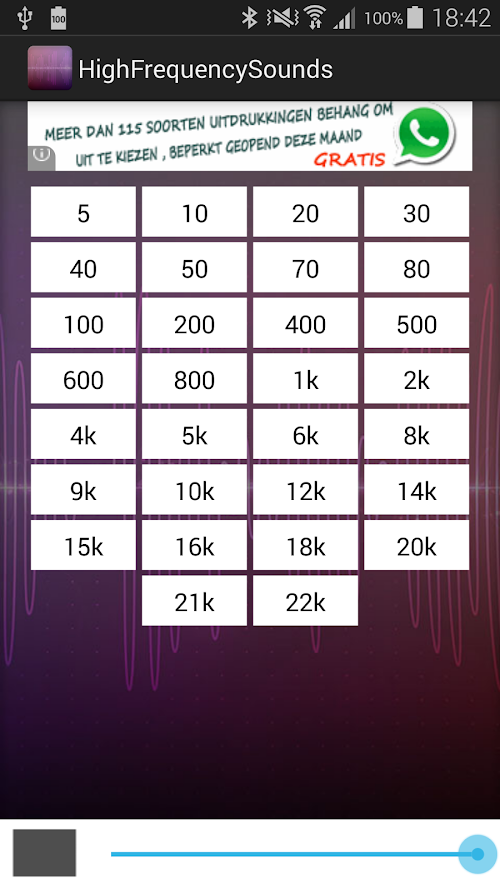Are you curious if your hearing is still as well as you think? Then this application helps you try out and test your hearing. Going to the doctor for a test is a waste of this, with this app you can just do it at home and for free! As a human being you can generally hear frequenties between 64-23,000 Hz. But some people are able to hear a lot better than others, so test this out with your friends, family, or prank strangers on the street.