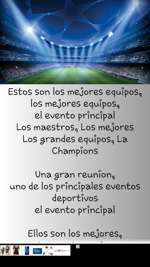 Con el himno champions tambien podras rememorar todas las tardes viendo jugar al equipo de tus amores y al equipo champions que todos desean campeon y solo unos pocos consiguen el ansiado trofeo, para todo ello y mas el himno champions y letra , tanto si eres del real madrid o del barcelona para todos los amantes del futbol de verdad!Anthem Champions and lyrics!