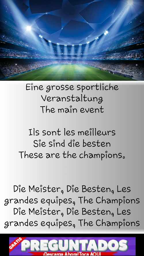 With the anthem champions too can remember evenings watching the team play of your love and champions team that everyone wants to champion and only a few get the coveted trophy for all this and more the champions anthem and lyrics, whether you're real madrid or barcelona for all football lovers really!