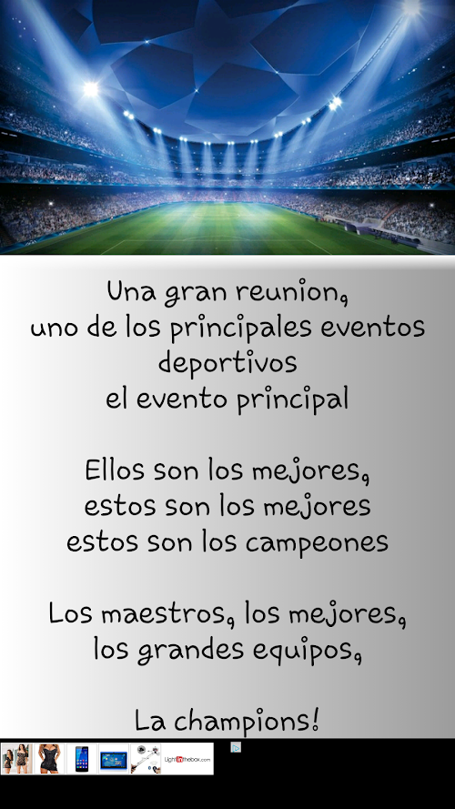 La liga de los campeones! La liga de los mejores equipos de europa, de la cual solo queda uno campeón y este es tu himno para recordar a cada momento que tu equipo es el mejor!