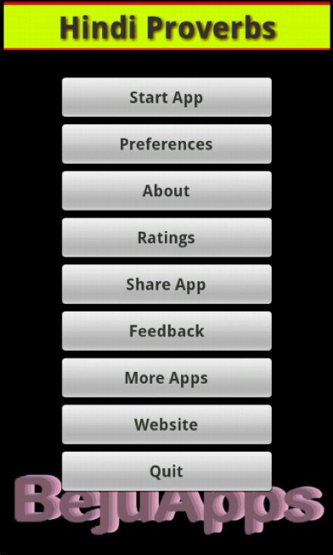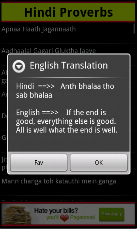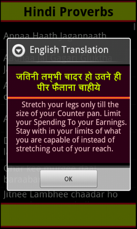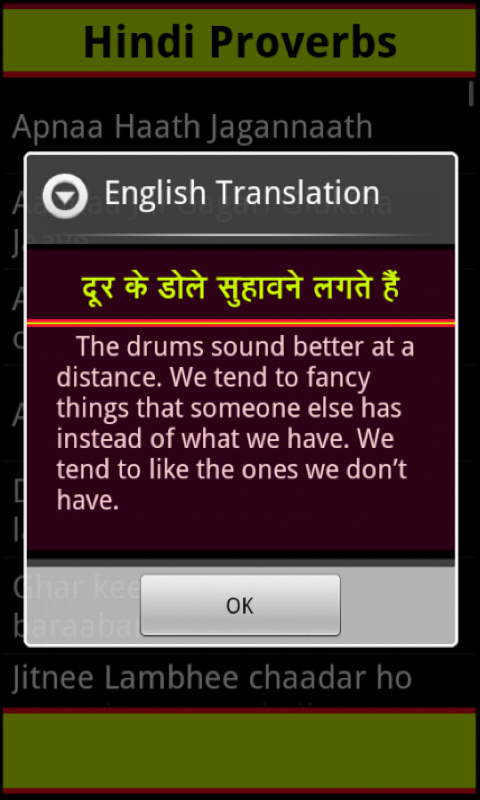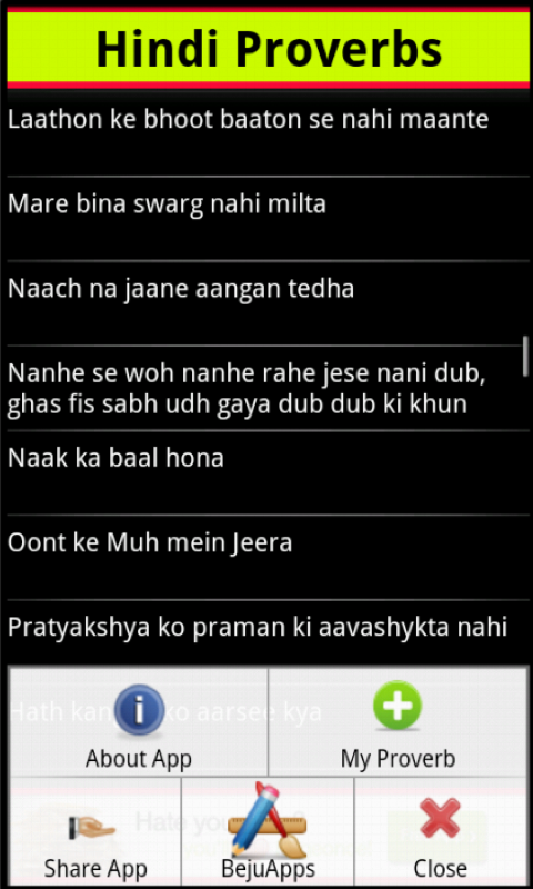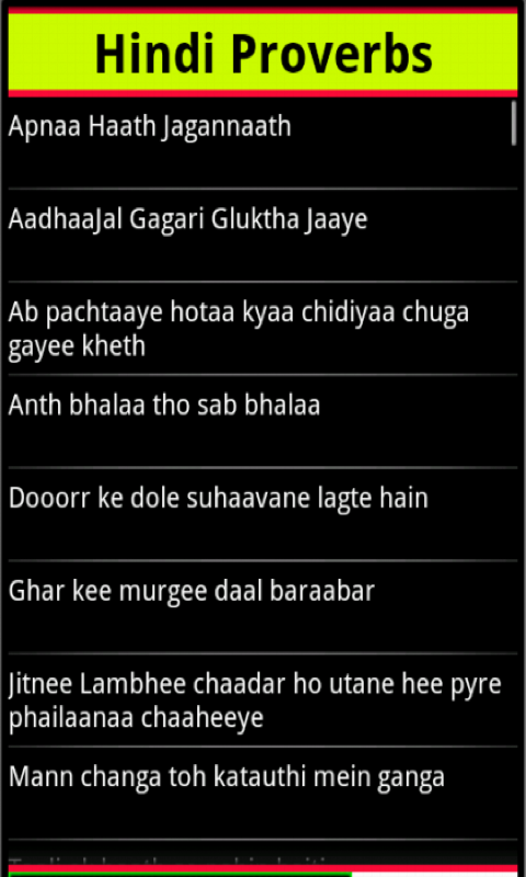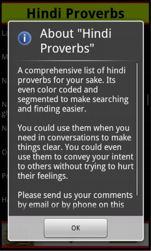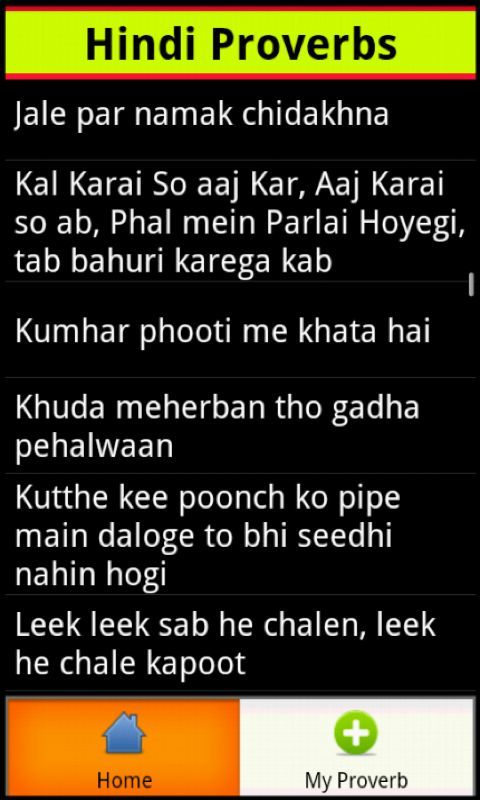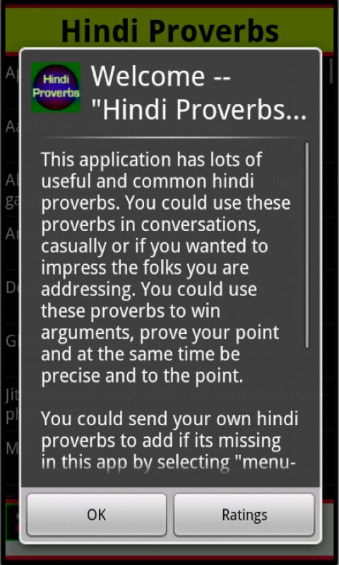 A comprehensive list of hindi proverbs for your sake. Its even color coded and segmented to make searching and finding easier. You could use them when you need in conversations to make things clear. You could even use them to convey your intent to others without trying to hurt their feelings. Please send us your comments by email or by phone on this apps location in android marketplace.