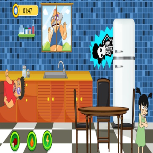 Featuring three levels of mayhem, it's your job to "persuade" your in-laws to leave your house. They arrive in the living room, so you escape to the kitchen and eventually the refuge of your kids bedroom - but they follow you, so armed with your fist, a stun-gun and a flame thrower you have to MAKE them leave!