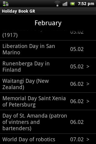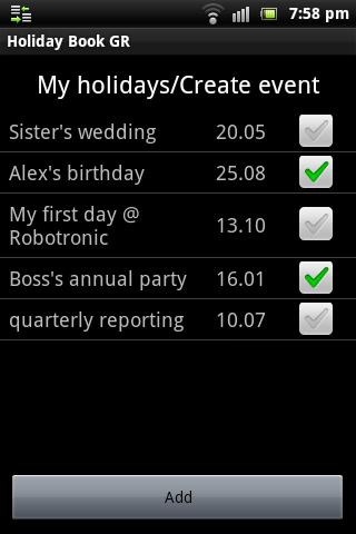 In this application is integrated a list of nearly two thousand traditional, professional, religious, national, or even exotic holidays around the world. Choose the celebration and mark the contacts, which you want to congratulate. By default, the message is: "Congratulations!", But it can be changed. So, you technically do not forget all friends, well, they will, of course, be thankful! Imagine how pleasantly surprised your friend, Cambodian, if you greet him with the Independence Day of Cambodia on January 7? Or your partner, Texan, when he receives a greeting with Day of Confederation on January 15? You all program it only once, and your smartphone (or tablet) will automatically send greetings by schedule.