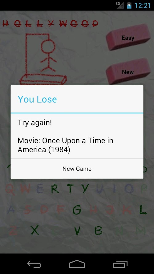 You can't help but recall the good old memories of the pen and paper Hollywood game and relive the thrill of getting away with mischief in a dull lecture. The game challenges you to guess the name of an English movie and escape from the Hangman who tries to strike all the letters of the word Hollywood and hang you.