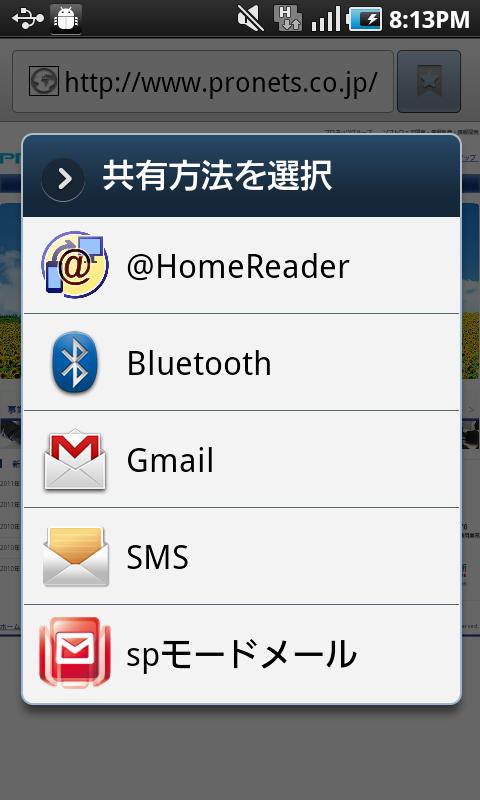 1.webブラウザで転送したいwebページを閲覧している状態でメニューを開きます。