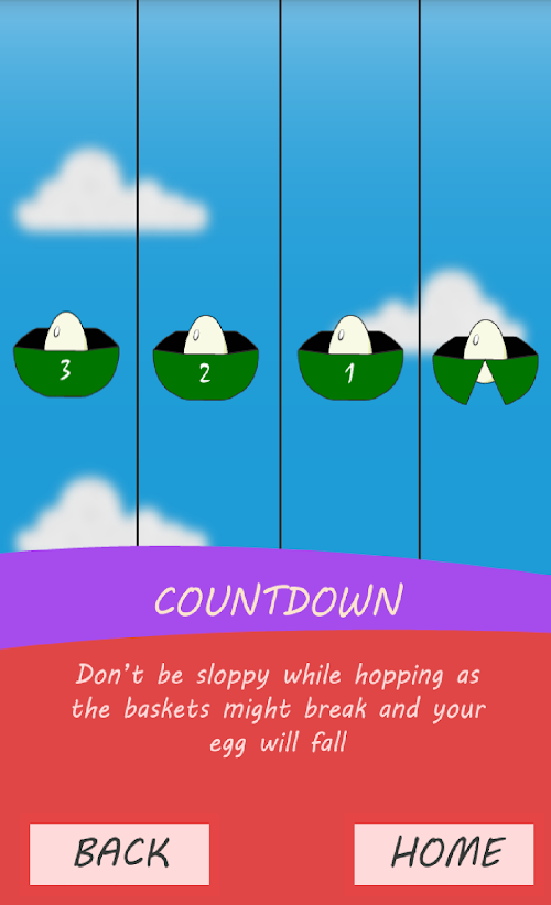 - Countdown - Don't be sloppy while hopping as the basket might crack and your egg will fall.