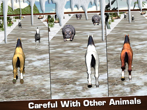 Control your cute horse that is on the run in the jungle, help him escape. Your horse must not crash into other giant animals like hippos and zebras that come on its way. Make the horse jump over the obstacles smoothly without hitting them. All the horse and pet animals lovers, who like to play 3D simulator games will love to simulate the real horse in this jungle run simulator game.