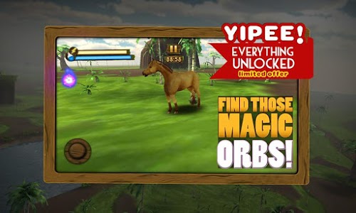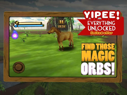 > The angry horse runs around in a 3d jungle simulator, catching orbs in order to free his friend from an evil enchantment.