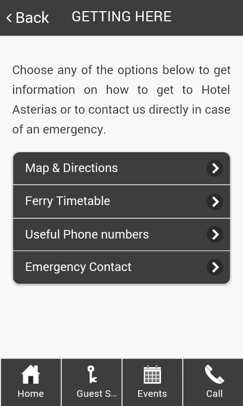 • The ability to initiate an emergency contact form and request assistance with geolocation (GPS) abilities, allowing the reception desk to receive your whereabouts and offer assistance.