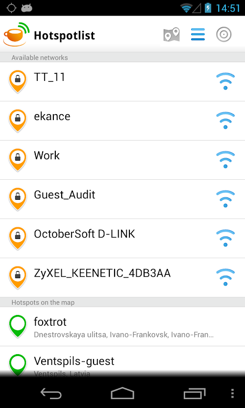 Mobile application Hotspotlist helps you quickly find the WiFi access points nearby and around the world. Look for new Wi-Fi points and share with founded points with users of Hotspotlist.ru. Ability to work in offline mode will find a free Wi-Fi without access to mobile Internet.