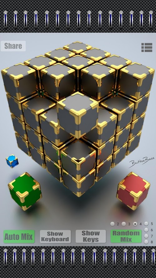 The House cube 2 is another ButtonBass cube with 31 loops that are all matched and synced for your mixing pleasure! Easily make your own House mixes that will sound just as good as the songs on the radio! Are you too busy to mix the loops your self because you are driving or having a party? Just hit the auto mix button and the cube will automatically mix for hours. Randomly generate a quick beat using the random mix button. You can change the amount of samples it will randomly mix by tapping the 1-8 buttons next to the auto mix button. You can control the samples using your phones keyboard. Just tap the show keyboard button and you can start and stop samples with the keyboard. The return button will stop all samples and the space bar will re-sync them all.