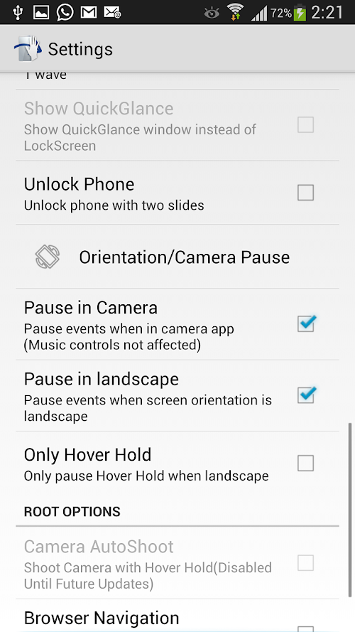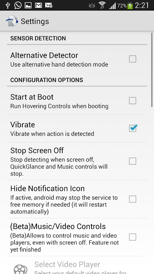 Hovering Controls uses the proximity sensor of your device to register simple motions performed in front of your device. Predetermined apps can be launched by either hovering over the sensor, swiping once, or swiping twice. Silencing an alarm or ringtone is as simple as a hand wave. You can also control your media playback this way, allowing you to change to the next or previous song or video without ever turning on the phone screen and physically touching it.