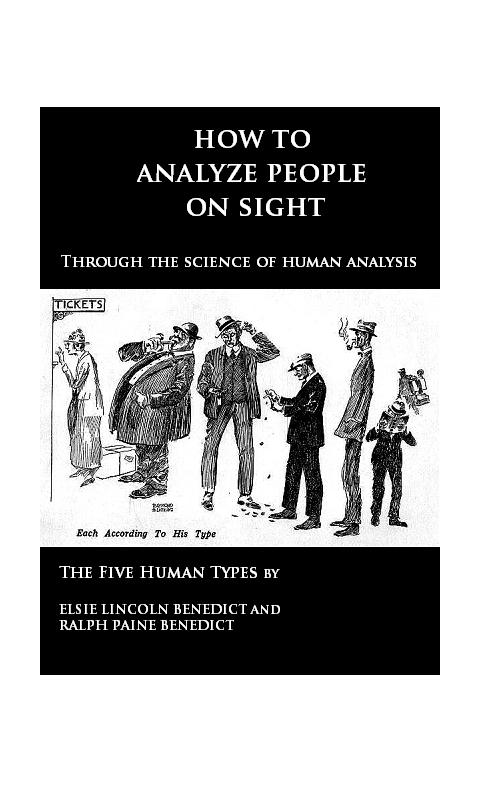 How to Analyze People on Sight Through the Science of Human Analysis: The Five Human Types was written by authors: Elsie Lincoln Benedict and Ralph Paine Benedict. It compares body types as relating to psychological profiling. We express who we are in innumerable ways...all different types of individuals to the examples given in this book. Interesting skill to attain with practice will definitely give you an insight into other people by just looking at them.