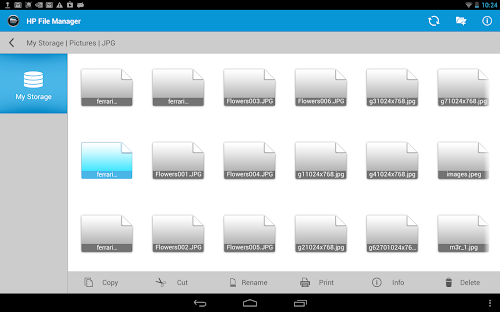 HP File Manager is only for HP platforms shipped with Android 4.4 and above. It will not work with other devices. HP File Manager is a file management application that provides file browsing, copying, cutting, renaming, printing and other functions on local storage/USB drives/SD Cards. If there are multiple applications installed that can open a file, HP File Manager allows you choose which app to use. HP File Manager depends on device format support (e.g. if your device can read but not write NTFS volumes, HP File Manager will only allow you to read from the volume).