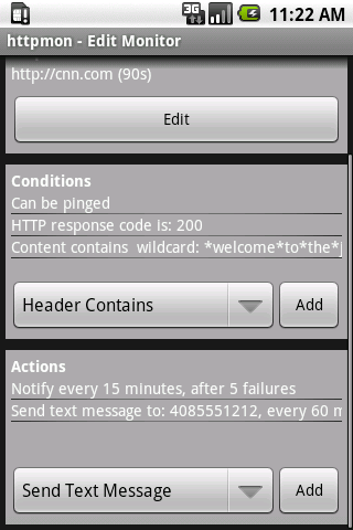 Monitor the status of your HTTP servers by periodically checking them against a customizable set of conditions. Send customizable notifications or SMS when they fail to meet those conditions.