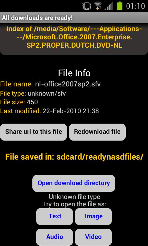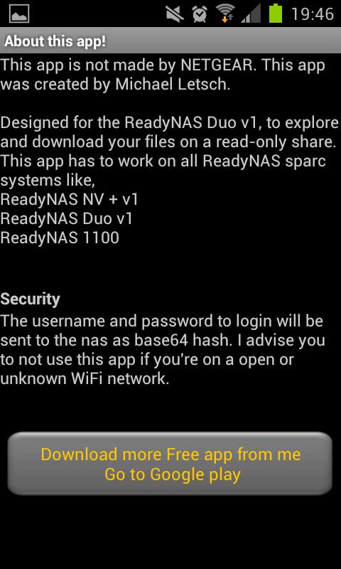 I developped this app because my Android phone always fails to download from my ReadyNAS Duo v1 in the default browser. If you ever have had the same problem then this app is your solution!