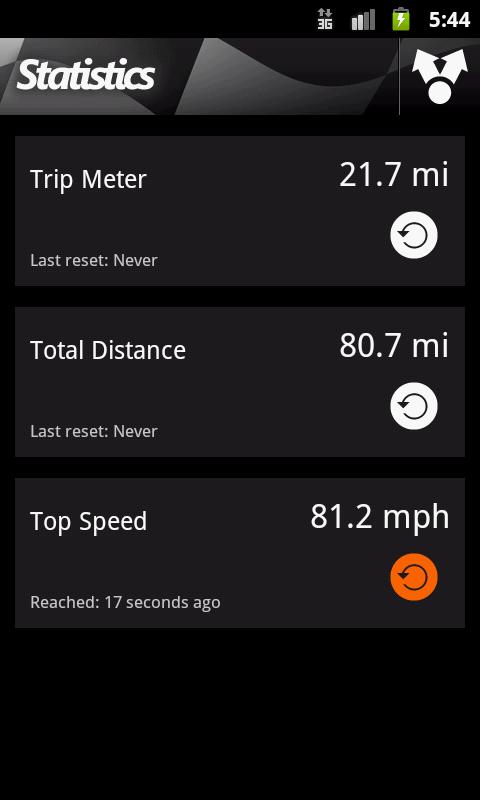 - Keeps track of your distance (trip and total distance) and top speed. (Also runs in the background with the screen turned off!)