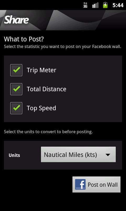 - Conveniently post any of your stats (trip meter, total distance or speed) to your Facebook wall!