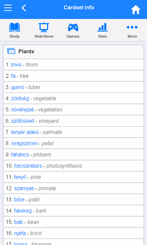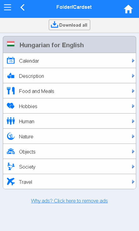 Hungarian flashcards app includes 4000+ premade Hungarian flashcards which cover the most used Hungarian words from 9 categories: