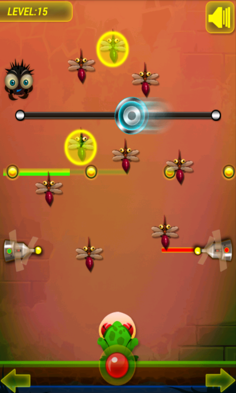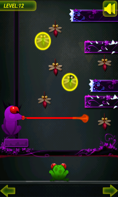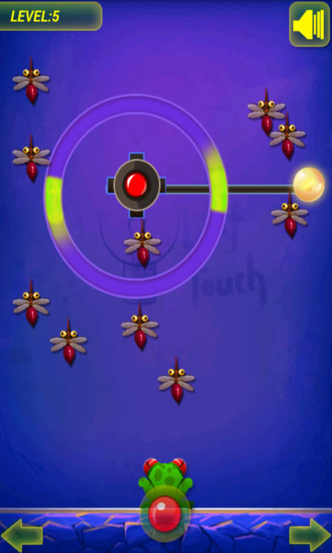 Hungry Frog is now set for hunting and eager to feed its stomach with Yummy Insects. These insects live in dangerous restricted areas where harmful laser and machines run! You can find two types of insects sitting on the wall, Red insect which is sleepy insect sits forever on the wall, whereas Green insect sits with a limited time and hence you must catch this insect before it gets time to fly back. Avoid Black Monsters which are harmful and poisoned- may take your life! You must hunt in a sequential order if you miss the order then all the insects will fly back. Keep feed this Hungry Frog!