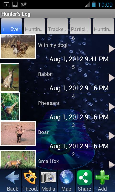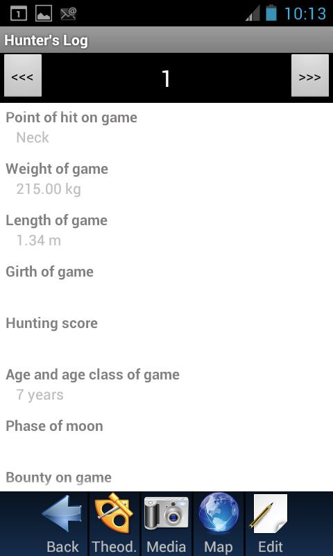 Each event comes with formatted fields to record a description of the event, detailed notes, weapon used, type of game, weight, length, distance to game, hit point, escape distance, hunting score, etc. Specific fields can be hidden and an unlimited number of additional fields can be added.