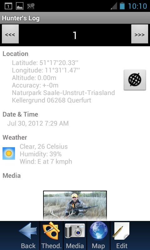 The Hunter's Log is a MajorForms android application meant for licensed hunters. The application allows you to track and document your hunting trip incorporating images, video, audio recordings, and/or text. It also allows you to track (with GPS) all or parts of your trip and enables the data to be synchronized to a free website created by you to store, edit, and/or share your trip with others. You can also allow family and friends to view your hunting during or after your trip by sharing it through your website, Facebook or Google+, Twitter, Linkedin, e-mail, etc. Once the hunting trip is uploaded to your website, you can edit the data, create reports and/or maps, and download the data or reports to spreadsheets or other documents. You do not need to have access to the internet to run the application, but if you do, you can upload your data and preserve it. In addition, the application comes with tools such as weather documentation which records the temperature, pressure, humidity, wind direction, etc. for each event. There is also a theodolite that enables you to determine distance to the game being stalked. The application now automatically documents the weather for each event. Give it a try, it is free. Once your hunting trip is completed, you can automatically create a lasting video memory of your trip. Check out similar apps on www.majorforms.com.