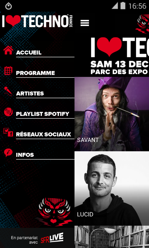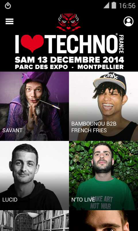 Cette application proposée par SFR Live Concerts, vous présente le programme complet de l'édition 2014 du festival I LOVE TECHNO FRANCE, qui se déroulera le 13 Décembre prochain au Parc des Expositions de Montpellier. Elle est le compagnon idéal pour préparer et profiter au mieux de votre soirée. 2011, 2012, 2013 : 3 éditions, 3 sold out ! Le Festival I Love Techno France revient pour sa 4è édition le samedi 13 décembre 2014 au Parc des Expositions de Montpellier pour ouvrir à nouveau ses 3 salles réaménagées avec plus de 10h de son non-stop. Le rendez-vous est pris avec les plus grands représentants des musiques électroniques.This application proposed by SFR Live Concerts, presents the full program of the 2014 edition of the festival I LOVE TECHNO FRANCE, to be held next December 13 at the Montpellier Exhibition Centre. It is the perfect companion to prepare and make the most of your evening. 2011, 2012, 2013: 3 editions, 3 sold out! The Festival I Love Techno France returns for its 4th edition Saturday, December 13, 2014 at the Montpellier Exhibition Centre to reopen its 3 rooms refurbished with over 10 hours of its non-stop. The appointment is made with the greatest representatives of electronic music.