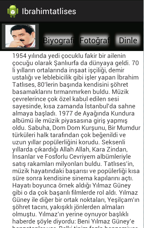 You can find all of thing about Ibrahim Tatlises. You can read his biografi, listen to songs, look his photos and the other things.