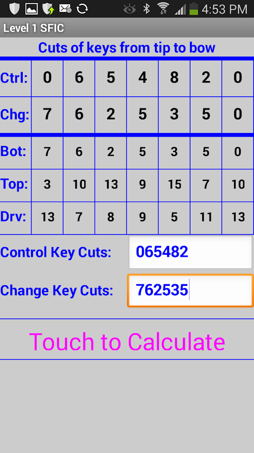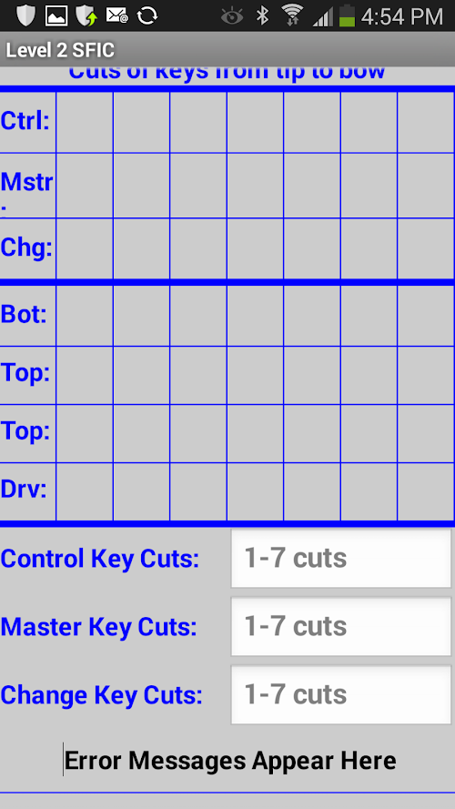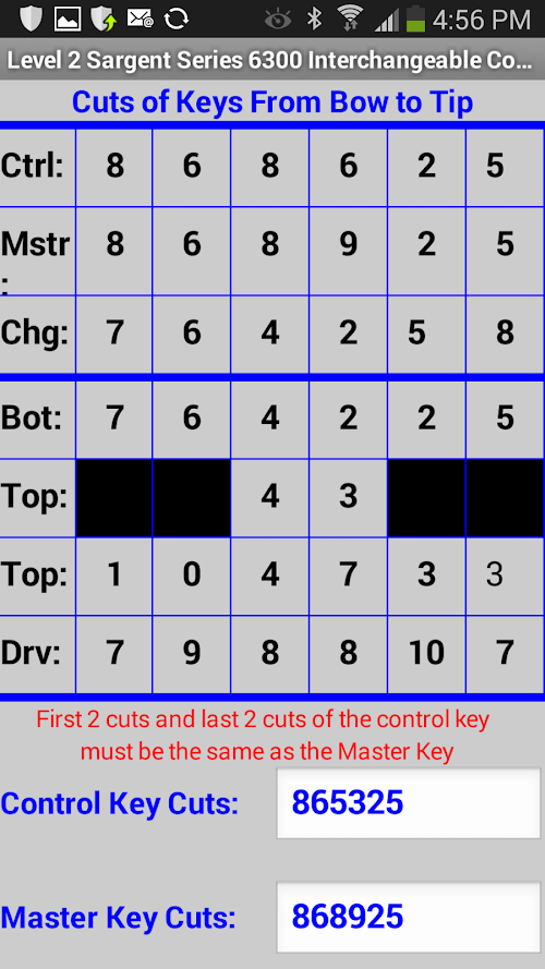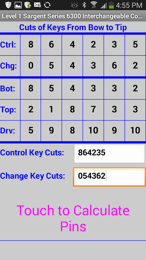 This APP has Best SFIC which includes Arrow Cores, and you can also do Medeco Keymark SFIC. Also included is Sargent LFIC and Corbin/Russwin LFIC. The SFIC core calculator will allow any number of pin chambers from 1 to 7. You can also change any key to recalculate a single chamber. For instance, if you have multiple change keys for multiple cores, such as 253643, 253645, 253647, you do not need to enter the full key bittings, you just have to change the last cut, and touch the Calculate button. There also a built in error checker to make sure that there are no #1 top pins, as it will tell you that you have to alter a cut to correct it. Being a locksmith myself, I have tried to make this as user friendly and helpful as possible while in the field, or working at the bench. Any suggestions for improvement are always welcome, so please feel free to send me feedback. Also, a positive rating would very much be appreciated. Hope you enjoy it! I have an awesome Auto App in the works also.