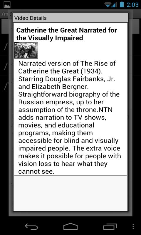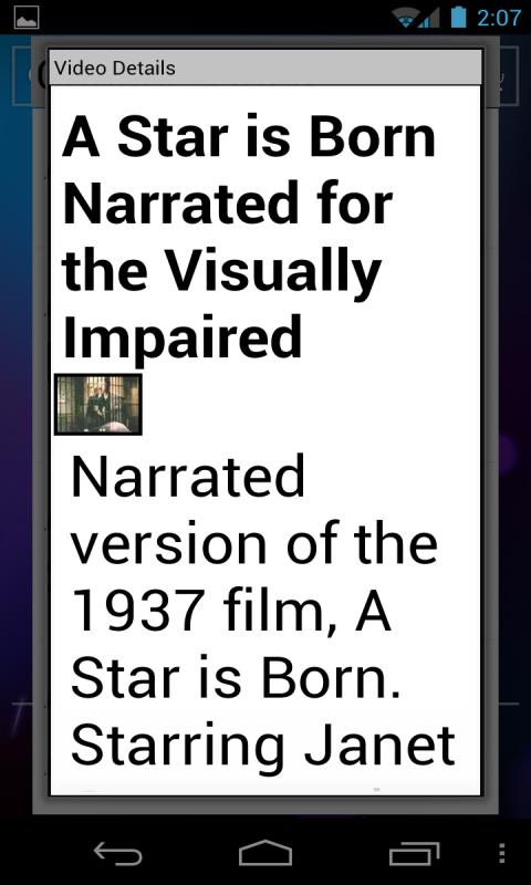 This Android application (accessible custom browser) was designed to make it easy to access and listen to Jim's Emmy Award-winning audio-described programming using Android mobile devices.