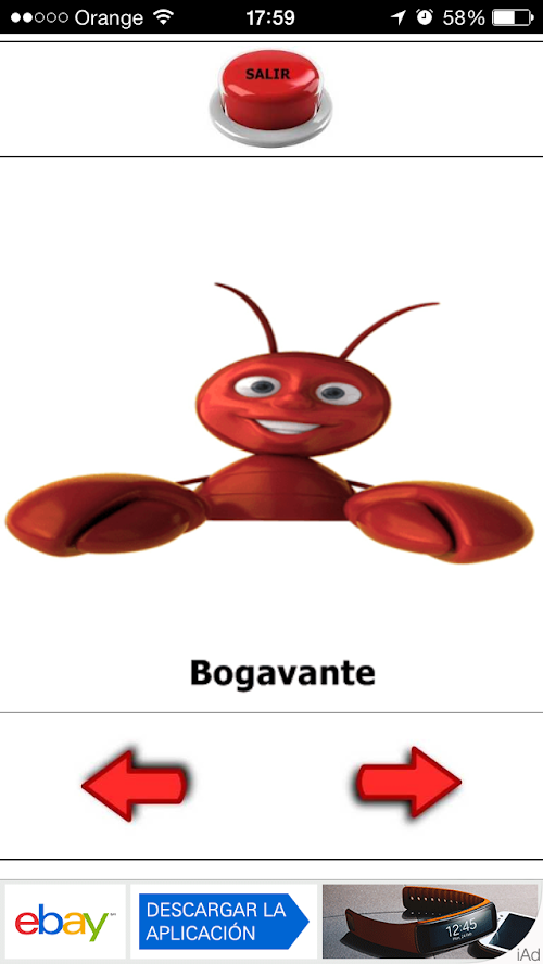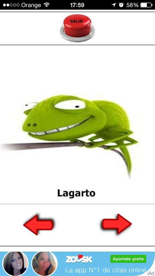 En cada imagen aparece las opciones de "siguiente", "anterior" o "salir" para que en cualquier momento puedas cambiar la imagen o categoría.Distract your baby with more than 100 images of different animals both animals water, soil or air.