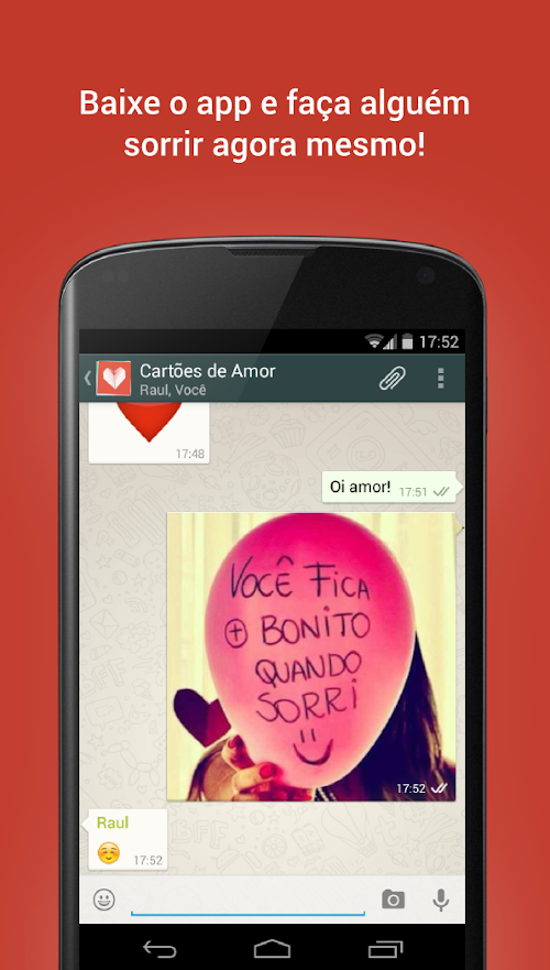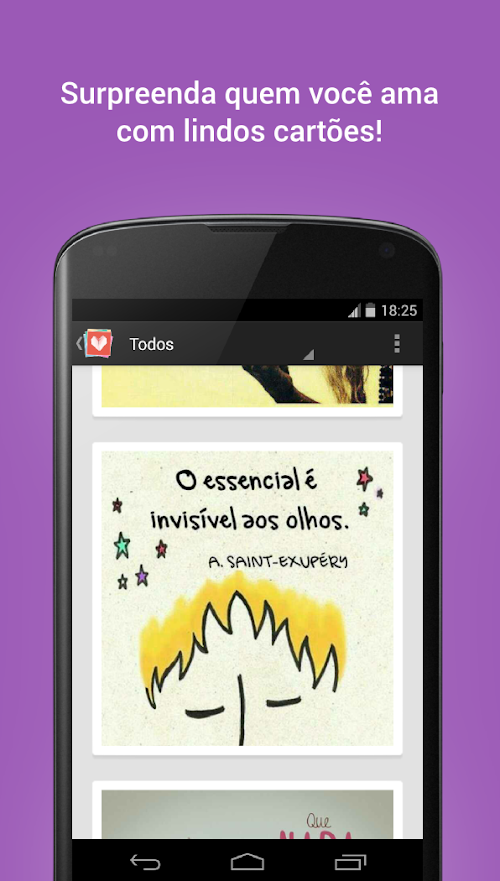 Surpreenda quem você ama com lindos cartões virtuais! Basta escolher entre as dezenas de imagens com mensagens disponíveis e compartilhar em seu chat preferido (Facebook, WhatsApp, Viber e outros).