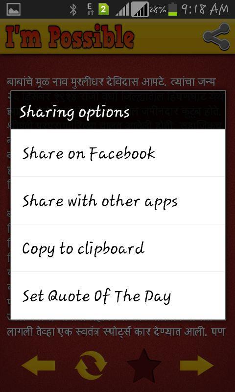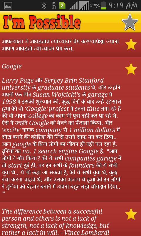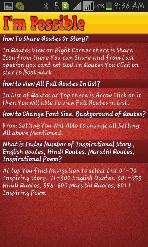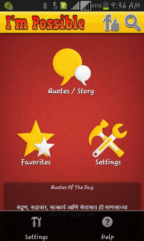 This application has quotes to help you in all aspects of your life, from the motivational sayings by Churchill and Lincoln to the philosophies of the Mahatma to poetry of Kusumagraj & Harivanshrai Bacchan